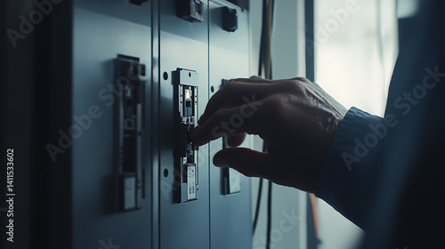 Electrician repairing a circuit breaker at a commercial building. Featuring electrical maintenance and repair