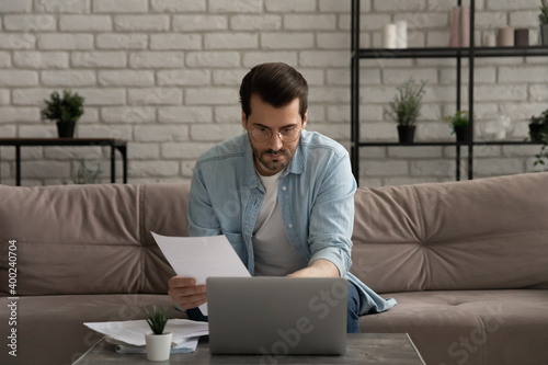 Electronic paperwork. Serious young man reading online and paper documents at home office paying bills using e-banking app on pc. Thoughtful male engaged at remote work from home at time of quarantine