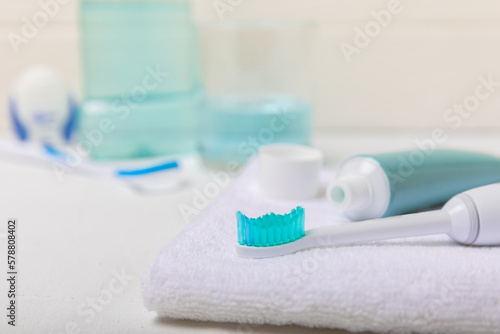 Electronic ultrasonic toothbrush and toothpaste on texture background. Items for dental care and caries prevention in the bathroom. Dentistry concept. Copy space.