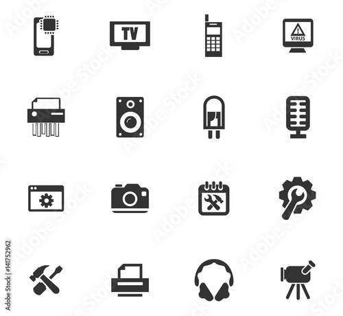 electronic, mobile phone, toy, earphones, smartphone, watching, contraption, table lamp, logotype, led, camera, small, symbol, flat, signs, control, design element, vector, repair, printer, camcorder, isolated, chat, spy, microphone, technology, icon, set, television, signal, gear