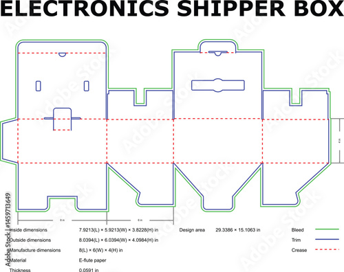 electronic, shipper, box, cardboard box, template, design, fold, dimension, measurement, cardbox, container, shipping, delivery, product, protection, fragile, material, cardboard, corrugated, paperboard, cut, score, crease, assembly, diagram, blueprint, illustration, vector, graphic, layout, manufacturing, production, industrial, business, e-business, retail, logistic, transport, shipment, prototype, bleed, trim, size, weight, volume
