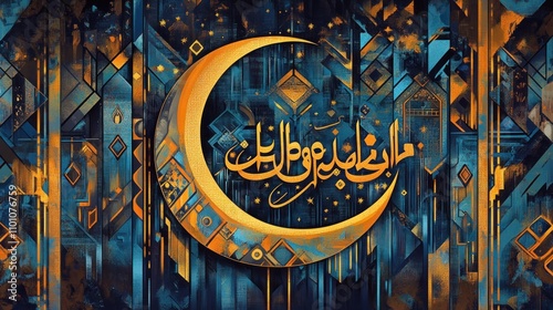 Elegant Arabic calligraphy spelling 'Happy Ramadan' surrounded by intricate geometric patterns, a glowing crescent moon and stars in the background, vibrant gold and blue hues,