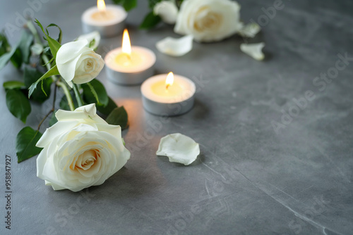 Elegant arrangement of white roses with lit candles on a gray stone surface, creating a romantic and serene ambiance