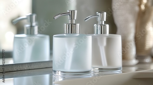 Elegant Bathroom Soap Dispensers with Chrome Pumps in a Minimalist Setting