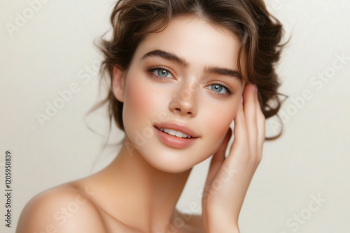 beauty, portrait, young, woman, elegant, freckle, smile, soft, light, background, skin, face, feminine, serene, closeup, minimalistic, delicate, peaceful, glow, simplicity, make-up, skincare, wellness, attractive, calm, pretty, gentle, smooth, pure, radiant, aesthetic, healthy, fresh, bright, complexion, grace, modern, chic, refined, balanced, relaxed, beauty care, care, hair, cosmetic, 1, closeup