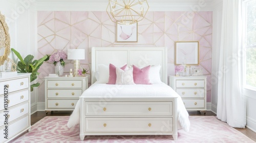 bedchamber, decor, geometric, pattern, gold, accent, soft, light, luxurious, design, interior, furniture, aesthetic, modern, pastel, floral, stylish, chic, comfort, cosy, wall, art, elegant, texture, clean, space, home, lifestyle, contemporary, arrangement, bright, inviting, ambience, warm, fresh, quality, detail, room, natural, relaxing, serene, uplifting, harmonious, trendy, eye-catching, beauty, visual, element