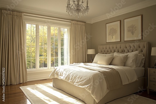 Elegant bedroom with natural light and cozy decor in a serene home setting