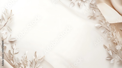 beige, floral, frame, fabric, drape, leaf, branch, white, cream, background, elegant, design, texture, minimalist, simple, subtile, delicate, soft, muted, pastel, neutral, calm, serene, peaceful, tranquil, romantic, wedding, invitation, card, stationery, template, organic, natural, botanical, style, aesthetic, beauty, art, illustration, composition, overhead, space, copy