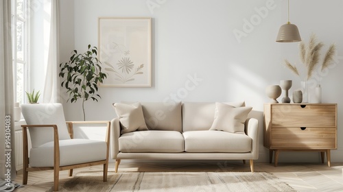 Elegant Beige Sofa and Armchair Setup with Sunlit Window View Perfect Living Room Decor