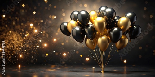 celebration, party, balloon, black, gold, luxury, elegant, festive, sparkle, shine, shimmer, dark, background, lighting, glossy, inflatable, decoration, event, anniversary, glamour, sophisticated, special occasion, happy