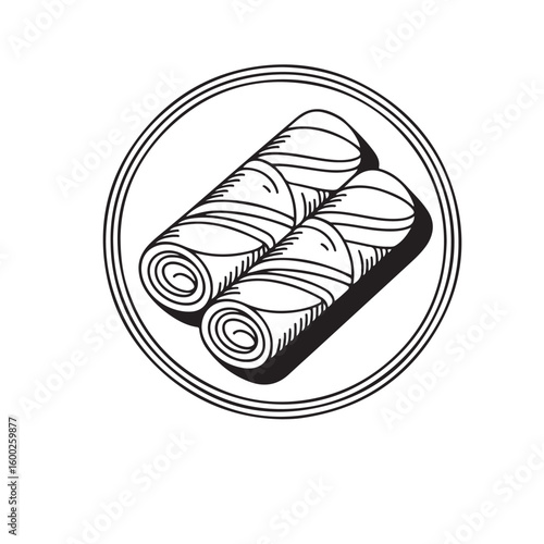 Elegant Black and White Spring Rolls Illustration in a Circular Border for Culinary and Restaurant Designs
