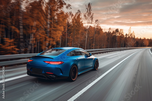 Elegant blue sports car on the road surrounded by the bright colors of the autumn forest, copy space area