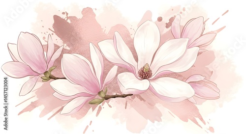 Elegant blush pink magnolia blossoms on a rose gold watercolor background.
