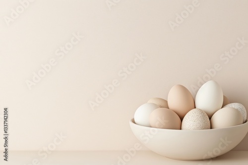 Elegant bowl of varied eggs featuring smooth and speckled textures on a subtle beige background, perfect for spring and easter themes
