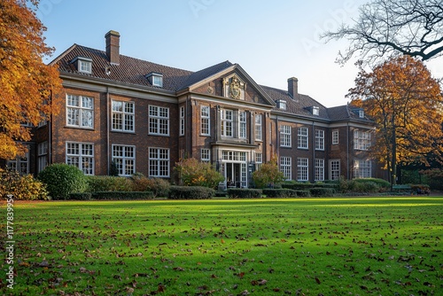 Elegant Brick Building with Autumn Trees and Lawn