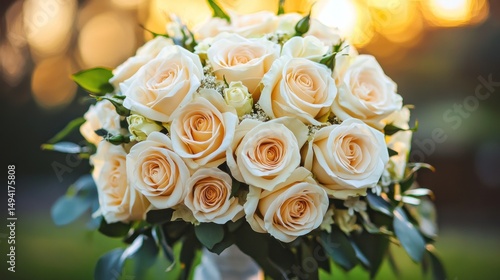 elegant bridal bouquet featuring soft peach roses against a blurred golden backdrop creating a warm and romantic ambiance perfect for wedding themes and floral designs