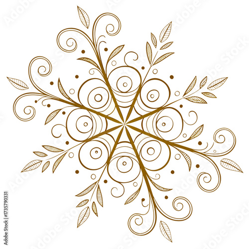 snowflake, ornamental, design, swirl, vine, leaf, floral, decorative, pattern, elegant, brown, white background, abstract, symmetry, geometric, winter, christmas, holiday, art nouveau, filigree, scrollwork, stylised, hand-drawn, illustration, graphic, element, isolated, clean, simple, nature, botanical, ornament, motif