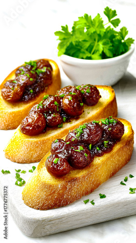 Elegant bruschetta with caramelized grape confit and fresh chives served on a light cutting board for an appetizer.