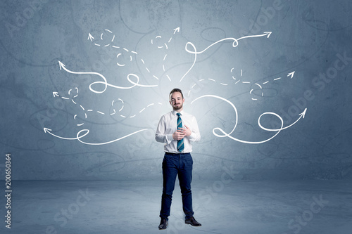 Elegant businessman choosing between directions with winding drawn arrows around