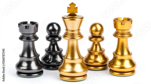 Elegant Chess Pieces in Black and Gold on a White Background