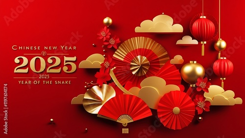Elegant Chinese New Year 2025 Celebration – Year of the Snake in Luxurious Red and Gold Design, New Lunar Year 2025