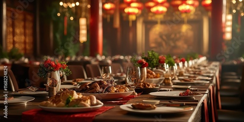 chinese new year, warmth, gathering, togetherness, harmony, ornate, joyful, prosperity, hall, ceremony, tradition, heritage, festival, joy, elegance, event, feast, grand, year, custom, festivity, reunion, ritual, abundance, banquet, family, chinese, new, red, auspicious, lantern, celebration, meal, decoration, culture, dinner