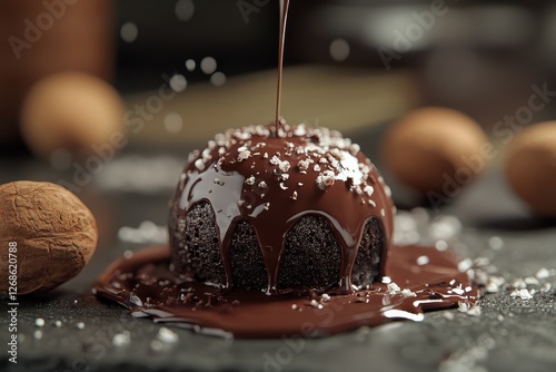 Elegant Chocolate Dessert with Drizzling Sauce and Garnish on a Dark Surface Surrounded by Nuts and Cocoa Powder