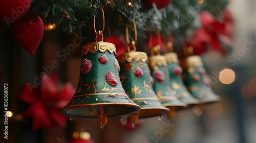 bell, holiday, ornament, christmas, festive, winter, season, jingle, red, green, gold, silver, glistering, sparkle, sphere, round, hanging, traditional, classic, elegant, cosy, warm, inviting, bright, cheerful, jolly, merry, shiny, glowing, twinkling, iconic, symbolic, holly, pine, mistletoe, chaplet, ribbon, bow, string, tree branch