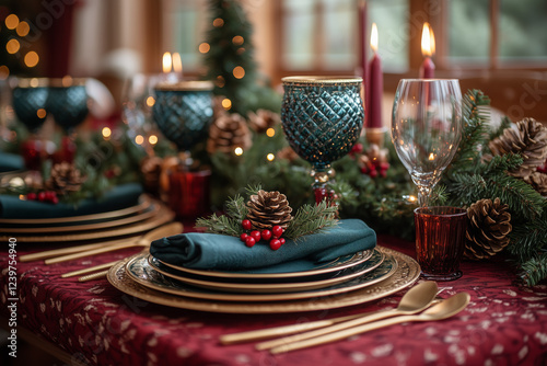 holiday, dining, tablecloth, red, gold, flatware, napkin, candle, holly, pine cone, christmas, feast, decor, festive, centrepiece, atmosphere, celebration, dinner, winter, event