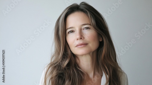 Elegant close-up portrait of a mature woman with natural beauty and long wavy hair