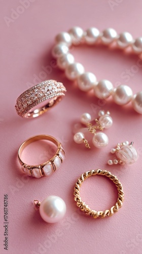 jewellery, pearl, gold, ring, bracelet, pendant, stylish, accessory, fashion, arrangement, pink, background, unique, design, elegance, beauty, luxury, gemstone, statement, hand-made, trendy, chic, craftsmanship, piece, elegant, female, pearl, necklace, shimmer, shine, casual attire, wear