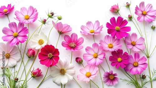 cosmos, flower, pink, white, red, floral, botanical, nature, blossom, bloom, flower petals, stem, leaf, bud, arrangement, composition, floral pattern, minimalist, vibrant, bright, cheerful, delicate, elegant, isolated, closeup, topview, studio shot, floral background, art, design, spring, summer