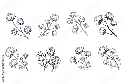 Elegant cotton flowers abstract line art contour drawings in a minimalist style. Perfect for modern decor, digital designs, and seamless patterns. Ideal for creative and stylish projects.