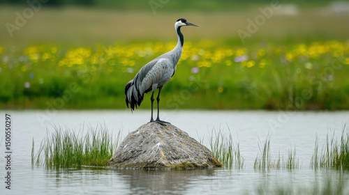 Elegant crane standing on a rock in a serene wetland surrounded by lush greenery and colorful wildflowers under a clear blue sky