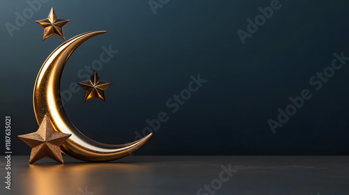crescent, moon, star, sculpture, reflective, surface, eid, islamic, celebration, sacred, festive, spirituality, glow, harmony, serene, tradition, decoration, beauty, illustration, night, symbol, vector, gold, icon, sky, design, three-dimensional, signs, gold, ramadan, art, space, arabic