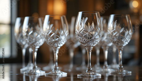 Elegant crystal wine glasses arranged on a polished wooden table in a sophisticated setting
