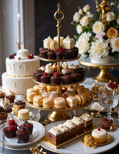 dessert, cake, cupcake, pastry, sweet, treat, gold, elegant, luxury, table, display, party, delicious, baked, festive, decorative, sophisticated, cream, variety, floral, arrangement, high-end, white, chocolate