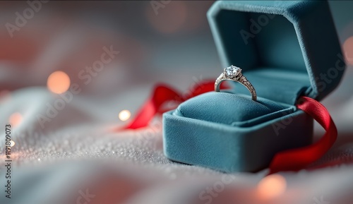 Elegant diamond engagement ring in a blue velvet box with a red ribbon, surrounded by soft bokeh lights, perfect for romantic and wedding-themed visuals