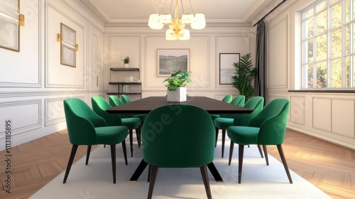 Elegant Dining Room with Green Velour Chairs and Wood Table