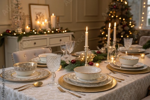 holiday, dining, table, setup, decor, china, glassware, candle, celebration, family, festive, light, elegant, decoration, meal, gathering, evening, atmosphere, joy, winter, food, party, plush, warmth, greenery, seasonal, stylish, comfort, bliss, togetherness, friends, spirit, cheerful, love, enjoy, laughter, memory, generative, ai