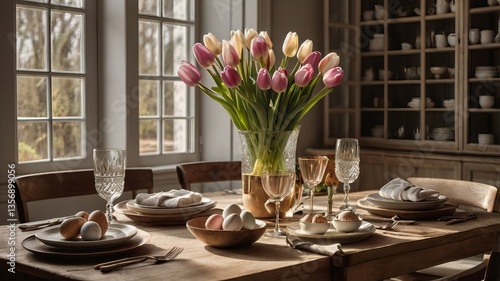 dining table, tulip, natural light, table setting, home interior, fresh flower, wooden table, warm colors, egg, cosy, serene, arrangement, interior design, cookery, hostess, gathering, entertaining, celebration, fresh, modern, stylish, decorative