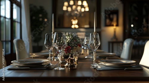 table, dining, room, elegant, luxury, dinner, setting, place, home, interior, design, decor, style, house, posh, sophisticated, upscale, modern, contemporary, formal, romantic, festive, celebration, gathering, glassware, cutlery, plate, candle, flower, centrepiece, arrangement, sunlight, shadow, wood, chair, window, curtain, ambience, atmosphere, rich, warm, inviting, cosy, comfortable, beautiful, aesthetic