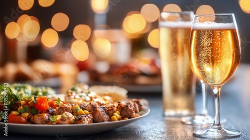 Elegant dining with drinks and flavorful dishes at a cozy restaurant during evening hours