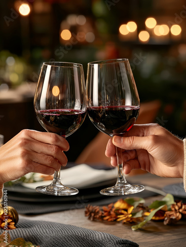 Elegant dining with hands toasting with red wine, festive decorations adding a cozy vibe