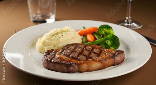 Elegant dinner plate with steak, mashed potatoes, and steamed vegetables, warm restaurant lighting, fine dining concept, gourmet cuisine, sophisticated presentation, focus on texture and plating.