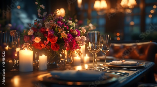 Elegant dinner setup cozy restaurant table setting evening close-up romance