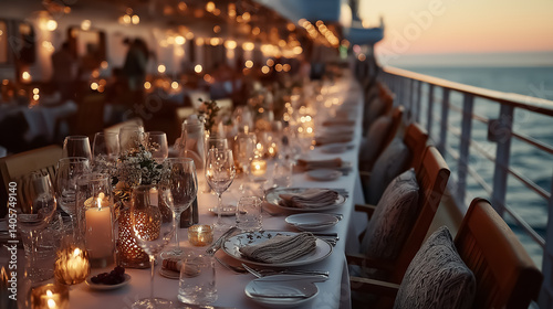 Elegant dinner table on a cruise ship deck at twilight, candles, wine glasses, soft ambient lighting, sea in the background, luxury vacation atmosphere