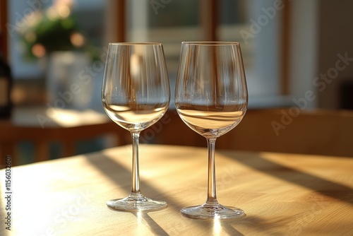Elegant display of wine glasses capturing sunlight in a cozy setting