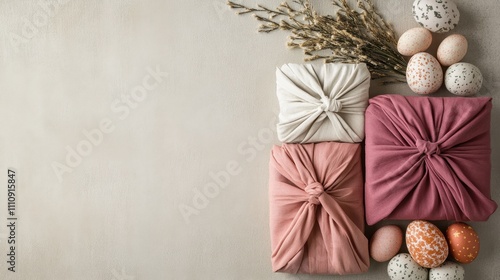 easter, gift, wrapping, decorative, egg, sustainable, environmentally friendly, japanese, tradition, fabric, textile, bow, pastel, celebration, festive, spring, trendy, hand-made, craft, knot, texture, cotton, silk, linen, creative, design, style, seasonal, pink, beige, natural, dried, flower, holiday, minimalistic, tabletop, recyclable, chic, elegant, culture, background, harmony, minimalist