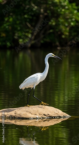 Elegant egret on a rock reflecting in tranquil water a serene nature scene